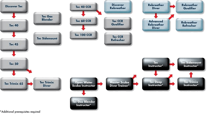TecRec-Kurse sind in ein umfassendes Ausbildungsprogramm integriert, das Sie kontinuierlich vom technischen Tauchanfänger zum Experten für die Verwendung von Mischgasen und die Planung von Dekompressionstauchgängen macht